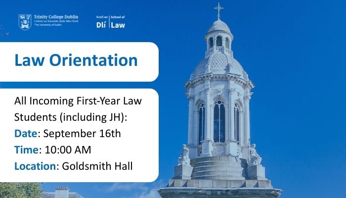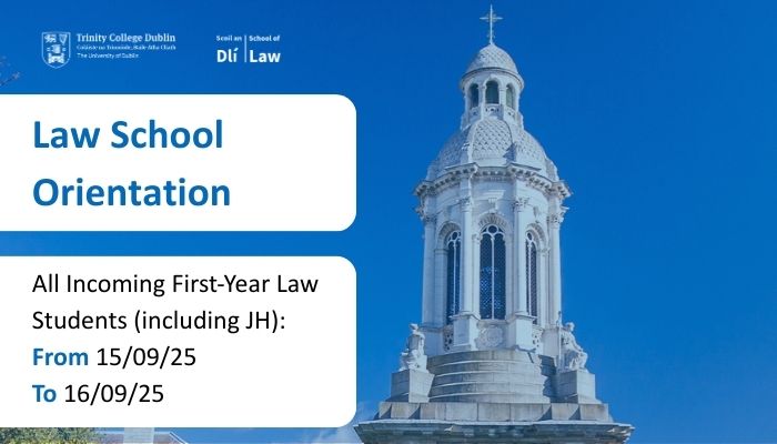 The Law School would like to welcome Junior Fresh (1st Year) students to the Law School with a selection of face-to-face Orientation sessions during Junior Fresh Orientation Week Monday 15 - Friday 19 September 2025. School Orientation for all Law courses will be held in the Goldsmith Hall. Orientation will provide the opportunity to meet with professors, and student societies. Further details on face-to-face teaching will be confirmed in due course and posted on this page. Teaching will commence on Monday 22 September for Junior Fresh students.