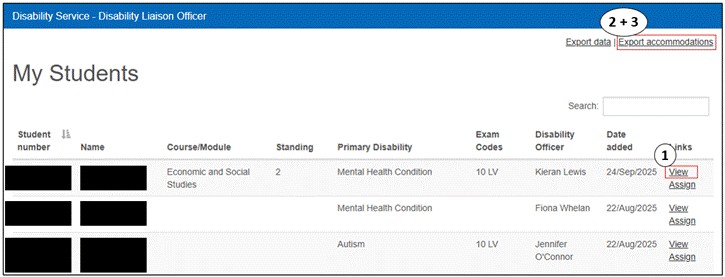 3. Student list with course accommodations : Click ‘Export accommodations’ and select ‘Course reasonable accommodations’ from the drop down, click the 'Retrieve' button and tick all the boxes on the screen, click the 'Export' button and an excel workbook will download to your PC. This will display the full list of students assigned to you, along with their course accommodations as listed on their LENS.