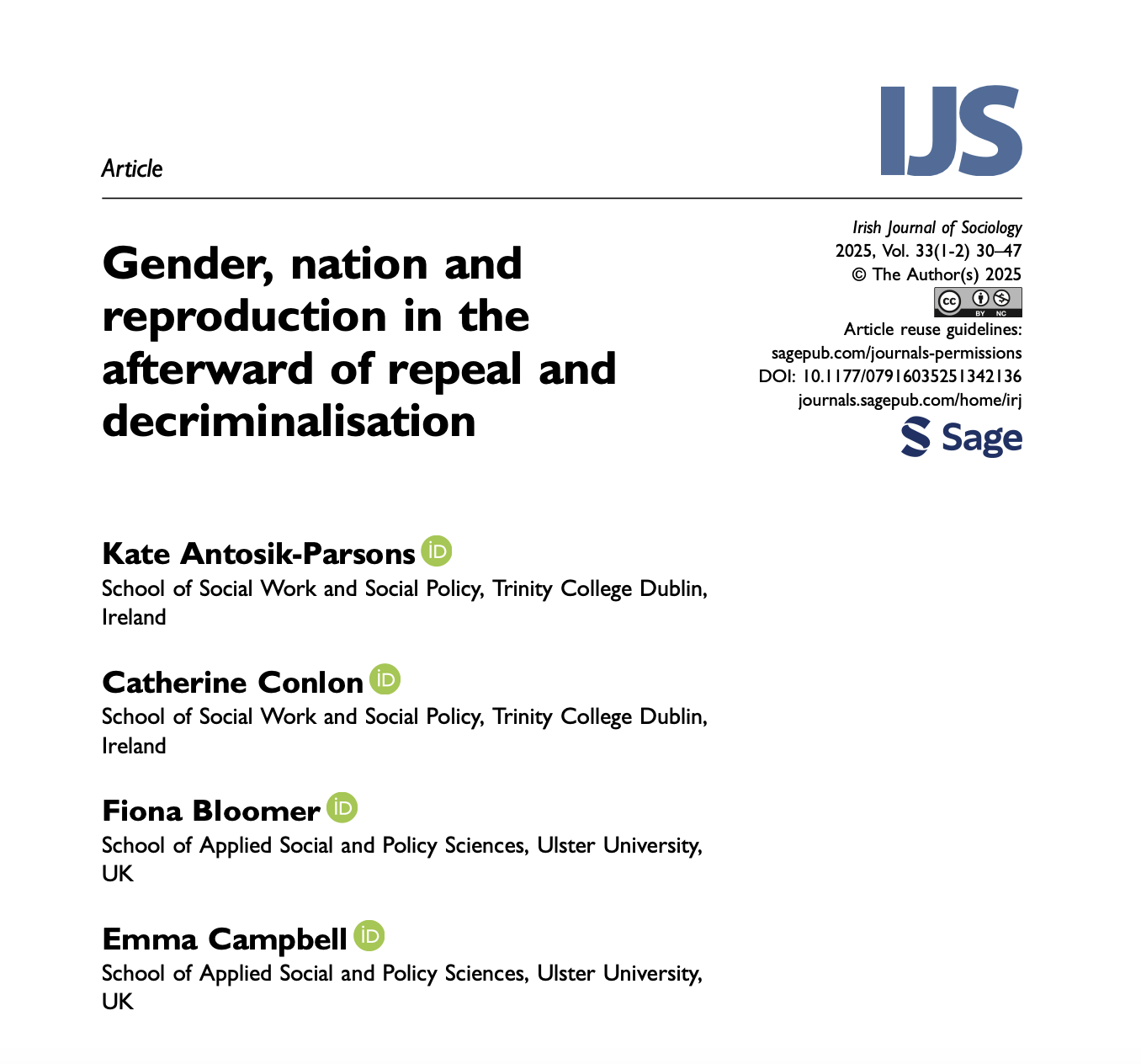 Dr Kate Antosik-Parsons and Dr Catherine Conlon are excited to announce the publication "Gender, nation and reproduction in the afterward of repeal and decriminalisation" in the Irish Journal of Sociology